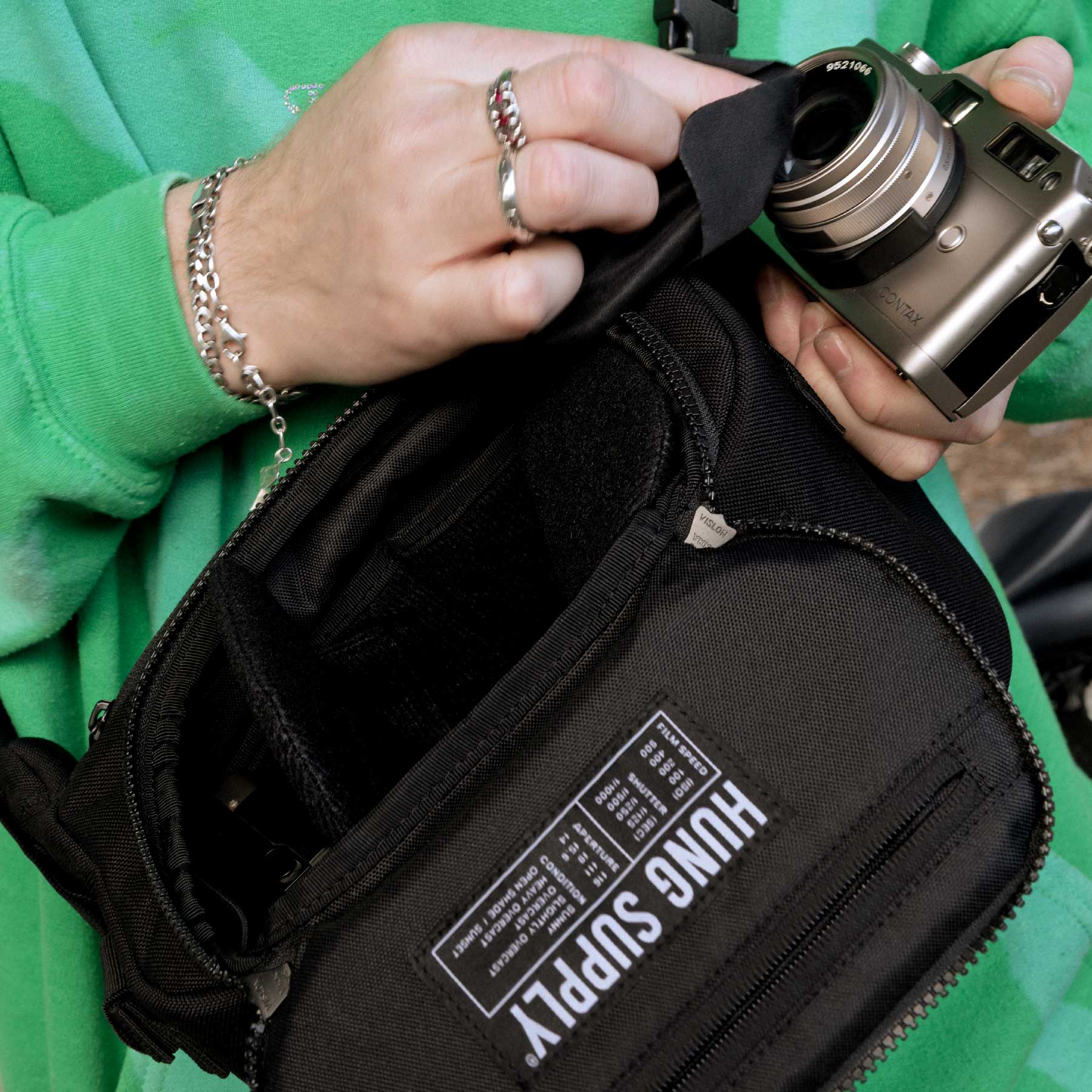 - Multiple zippered and quick-slip pockets for your film rolls, batteries, SD cards, odds and sods.
