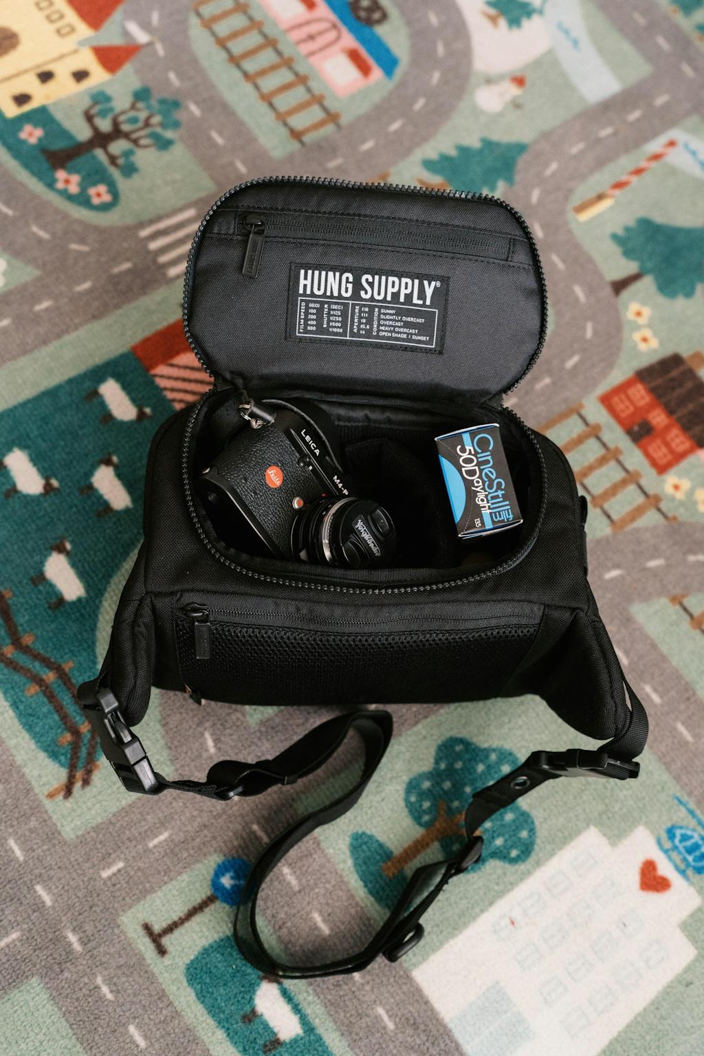 It comfortably fits my Leica M6 with lens, Ricoh GR3x, action camera, and film – without feeling bulky or putting strain on the bag.