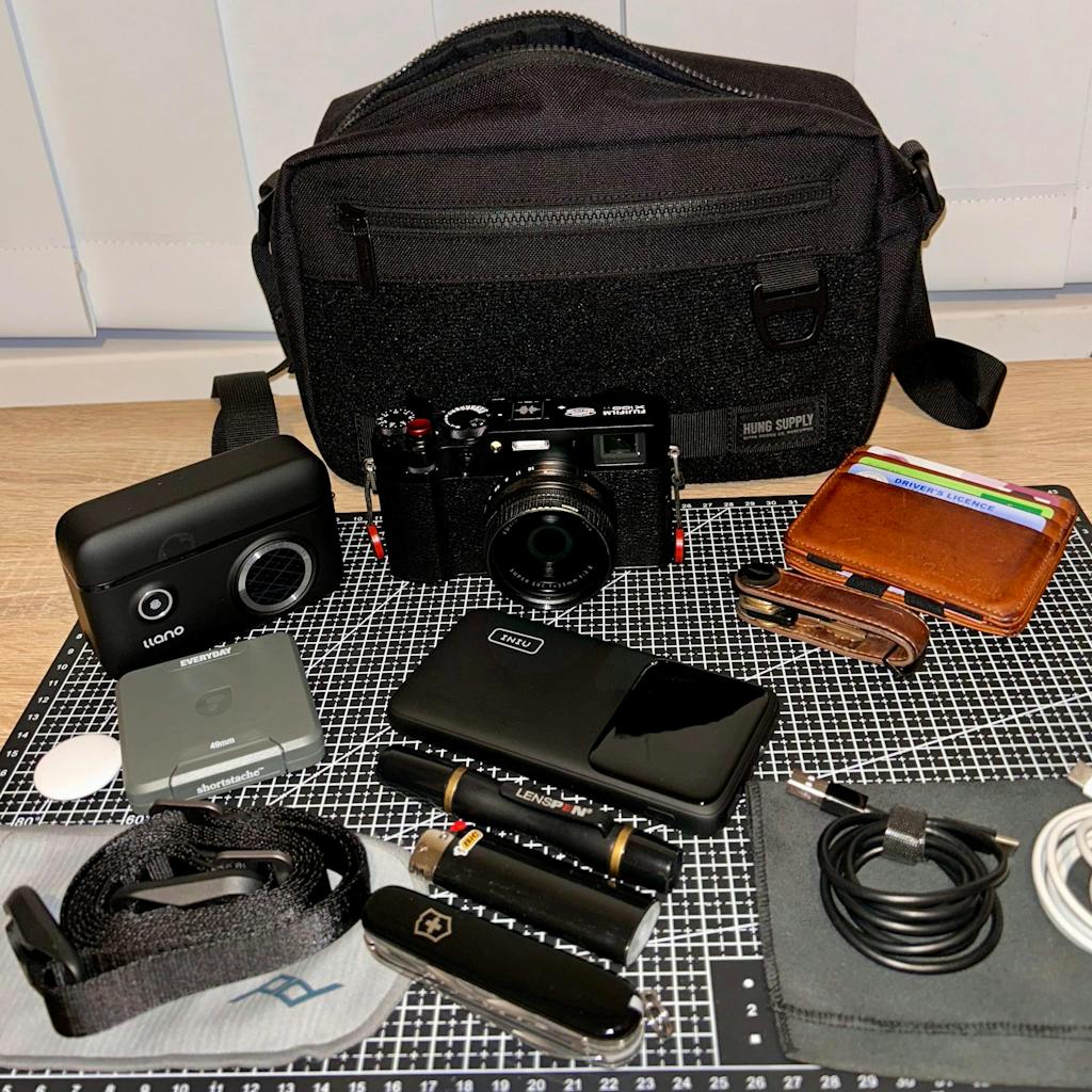I run a pretty tight "blacked-out" EDC kit (X100VI, power bank, wallet, keys), and the Hung Supply Hi-Fi swallows it all while staying incredibly slim. The build quality is top-tier—the 1050D nylon feels bombproof, which is a must for me living on the WA coast with constant salt spray and sand.